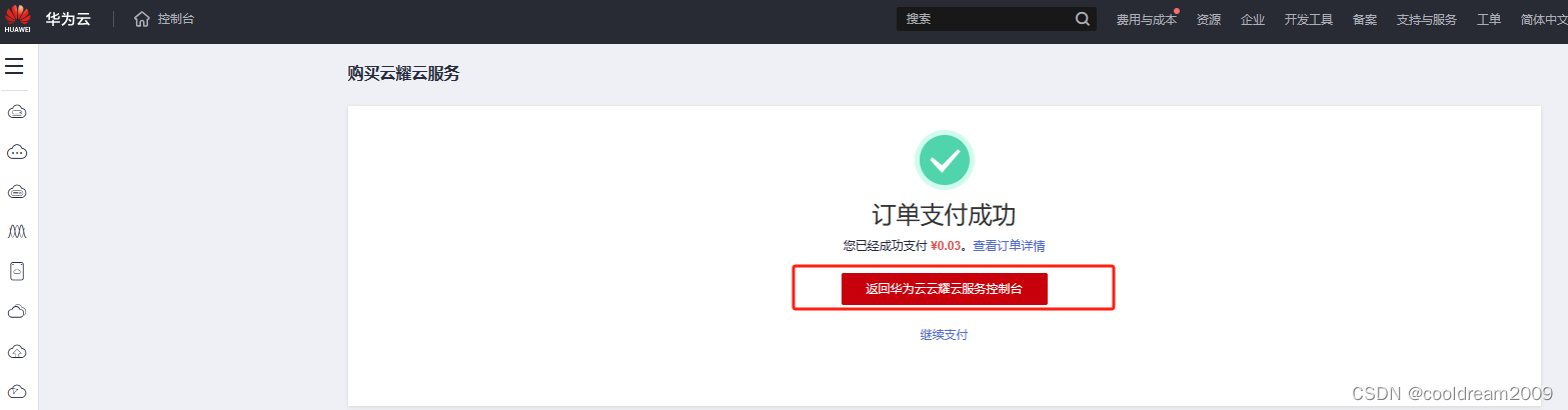 在支付界面,继续点击去在线支付,支付成功后会弹出支付成功信息,这时候就可以返回云服务控制台。