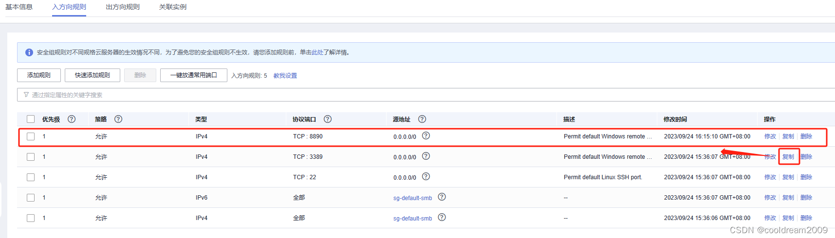 由于8890端口也是TCP协议,可以复制3389端口,然后将3389修改为8890,其他内容都不用更改,直接确定,就可以添加一个放行8890端口的设置。