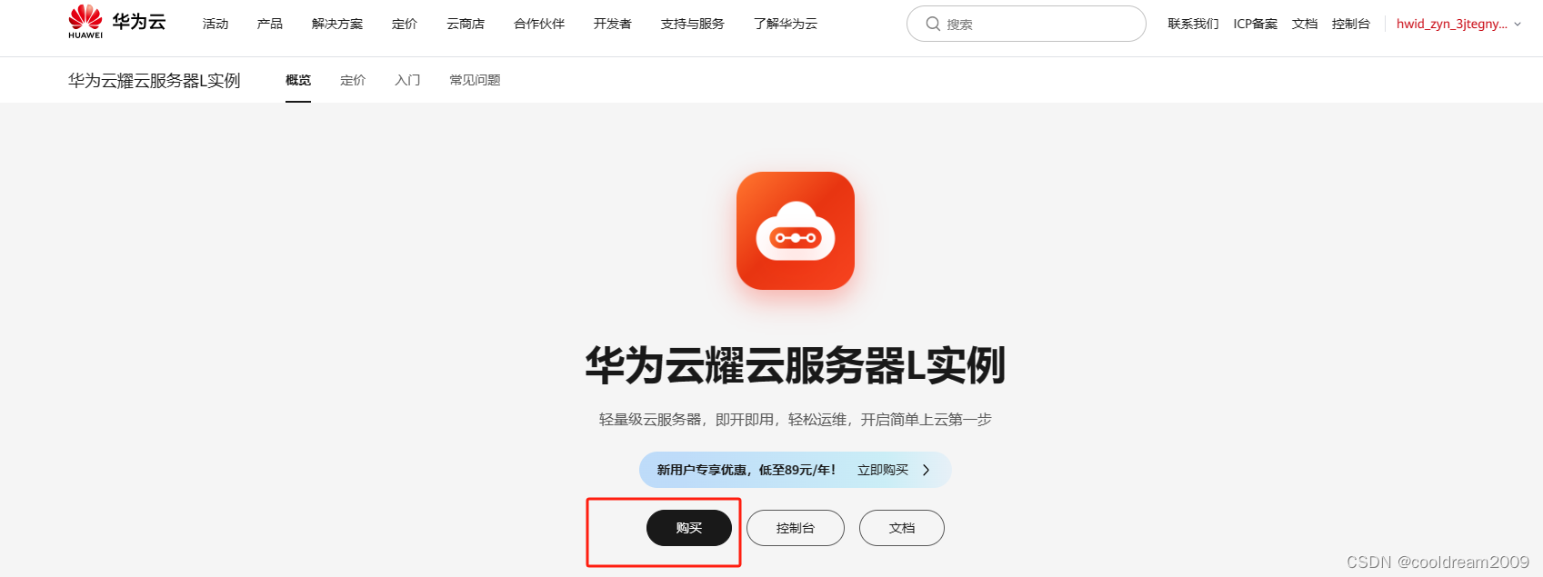 进入云耀云服务器L实例之后,点击购买。