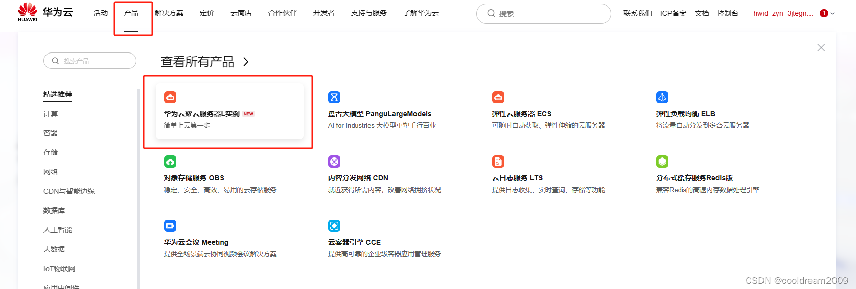 1.2 选择云耀云服务器L实例。登陆后,在控制台中,点击“产品”,然后选择您需要购买的云耀云服务器L实例。