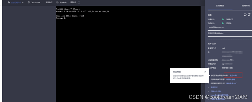 2.1 设置服务器密码。第一次获得服务器,需要为其设置密码,在界面中找到重置密码,点击。