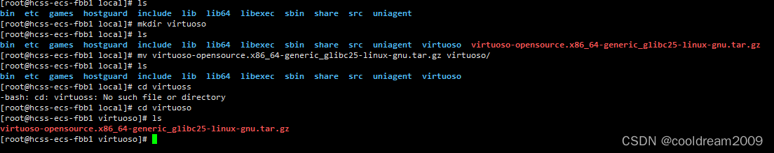 在/usr/local目录下,新建virtuoso文件夹,然后将virtuoso安装文件virtuoso-opensource.x86_64-generic_glibc25-linux-gnu.tar.gz通过mv命令移动到virtuoso目录下。然后