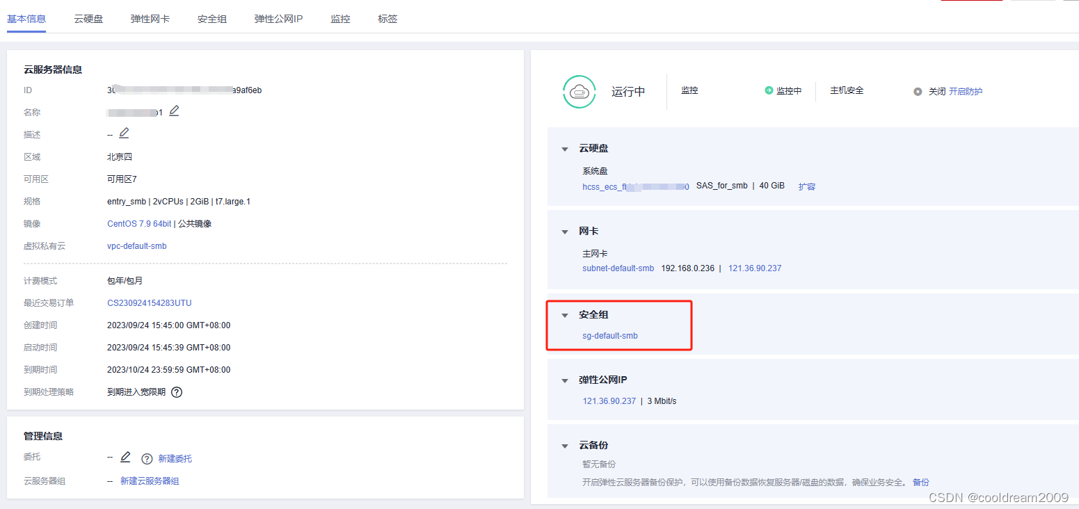 服务器默认只开通了3389端口和22端口,后面计划安装的virtuoso图数据库使用的是8890端口,所以需要将8890端口开通。在服务器中选择安全组,然后进入。