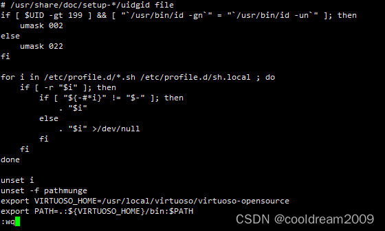 然后在编辑/etc/profile文件,将virtuoso的路径添加到profile文件中。通过vi命令进入profile文件