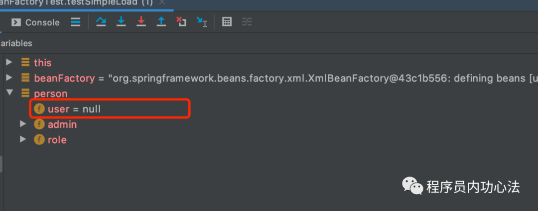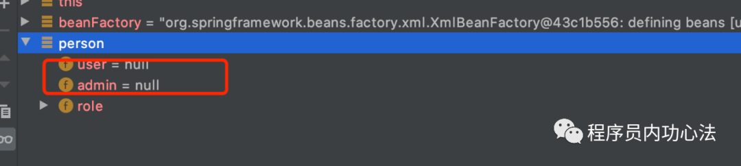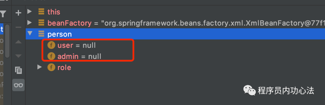 上图中我们可以看到person对象中的user属性值为空,说明user属性值在开启了ignoreDependencyInterface(UserAware.class)方法后并不能自动装配到person中(注意,user只是不能自动注入到person对象中,Spring容器中依然有user实例),到这里我们可以得到一个小结论:ignoreDependencyInterface方法是忽略指定接口(UserAwre)的set方法的自动装配!