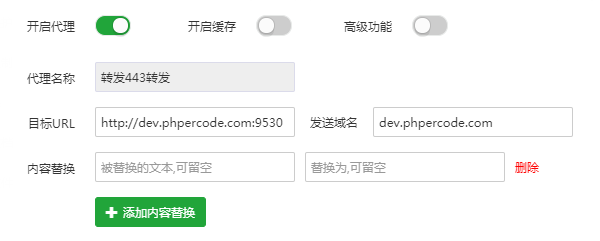“添加站点”dev.phpercode.com域名以后,后端使用其他端口,比如9530端口发布了服务,可用使用官方的反向代理进行配置