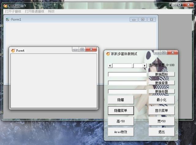 功能:可以让你的程序像QQ2010和迅雷7那样,换一张图片等于换一套皮肤.(支持的图片格式:png,bmp,jpg,jpeg.窗体上显示的图标支持格式:png,bmp,jpg,jpeg,ico支持真彩图标),vista/win7玻璃窗体风格,透明窗体特效