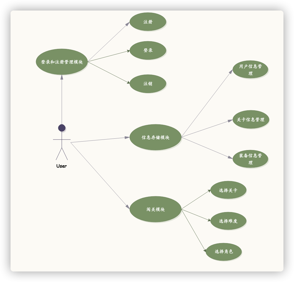 系统主要功能模块分析:登录注册模块,闯关模块(系统的主要业务模块),信息存储模块。