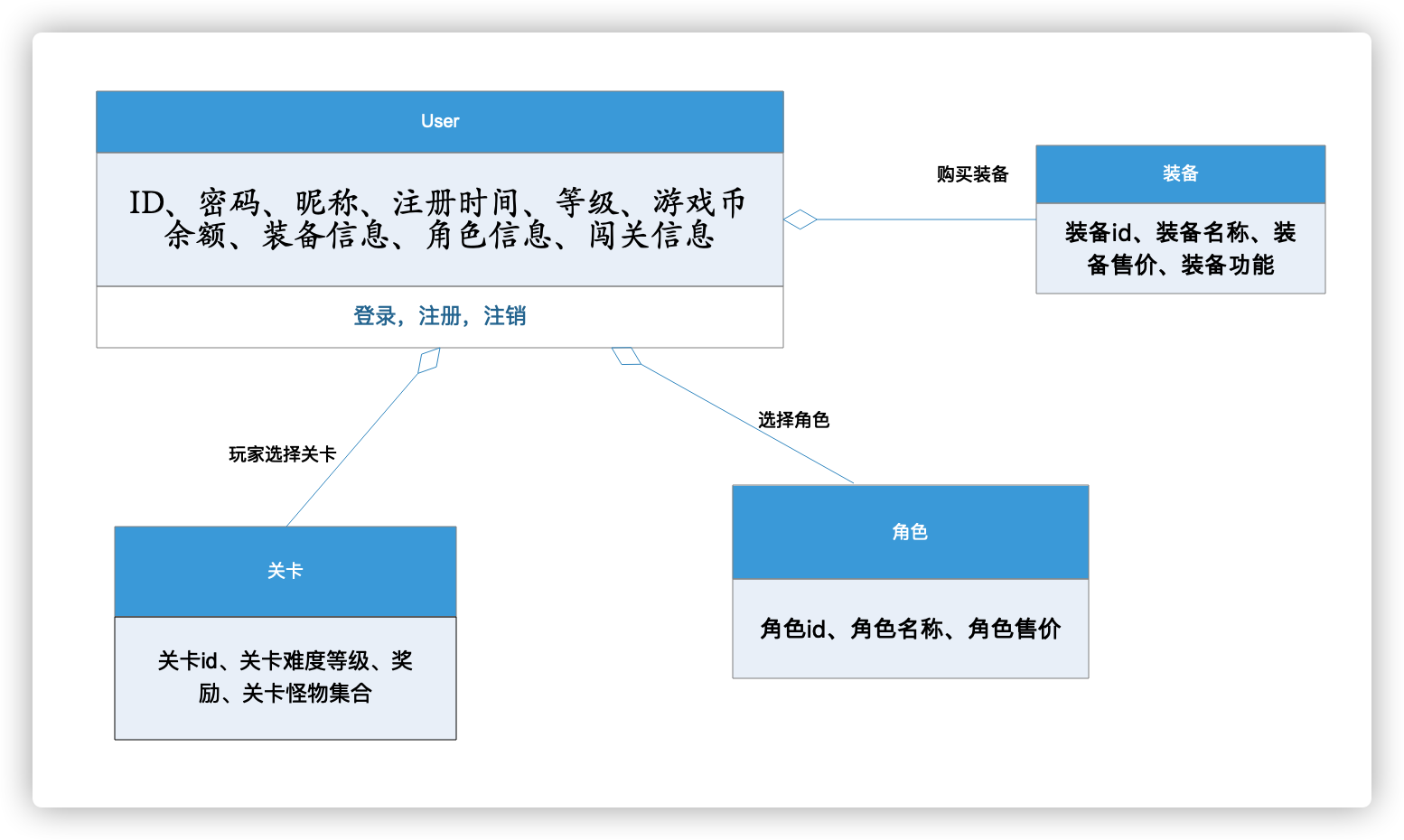 用户(ID、密码、昵称、注册时间、等级、游戏币余额、装备信息、角色信息、闯关信息)