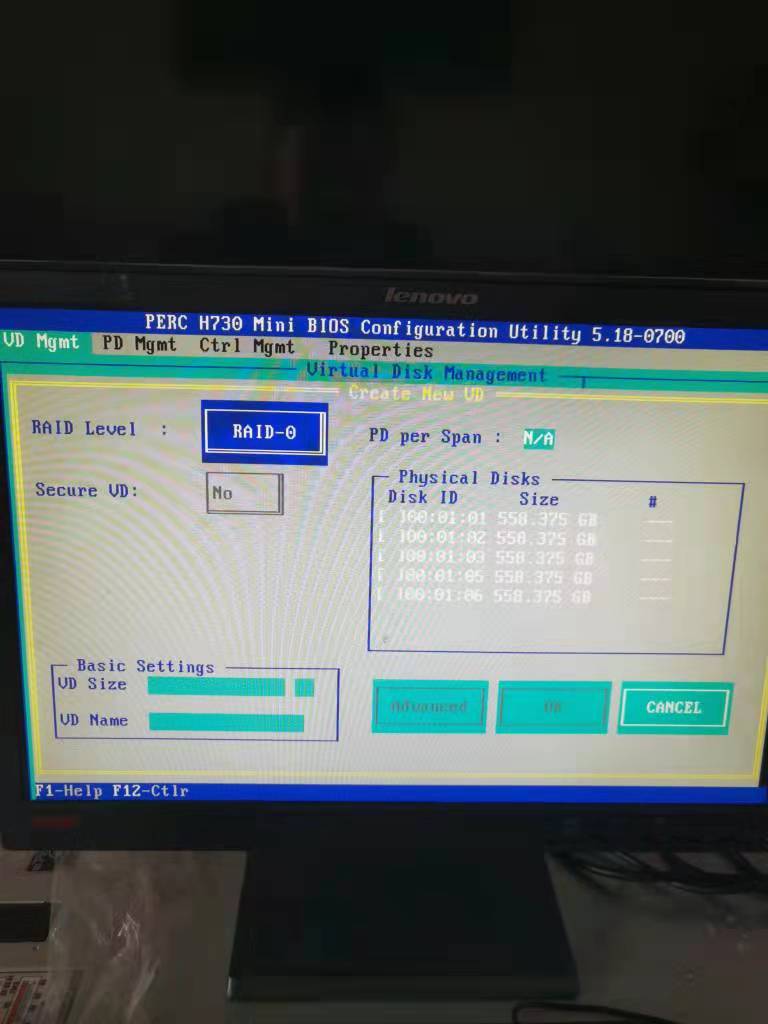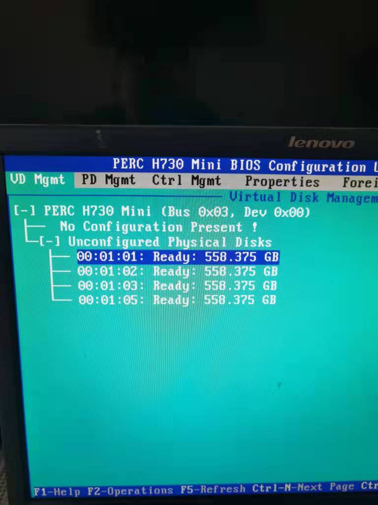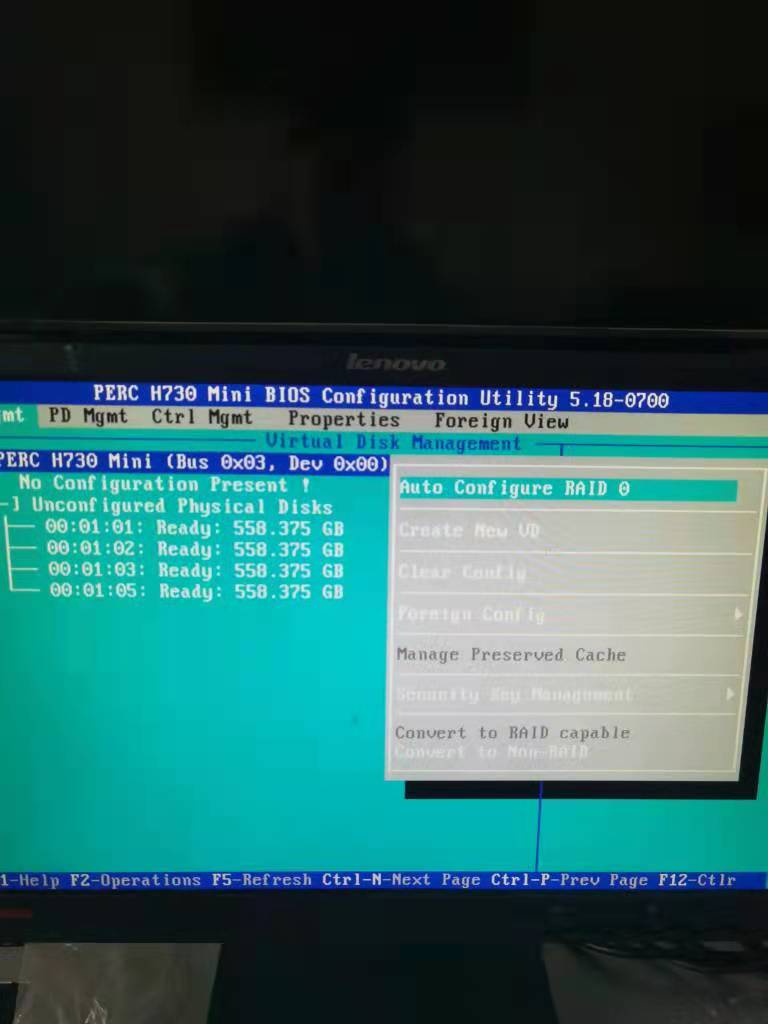 三、光标移到H730卡最上面按F2,选择fore开头回车后选择clear回车,删除所有阵列,后选择yes。再将光标移到H730卡按F2,选择creat回车