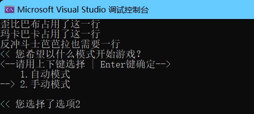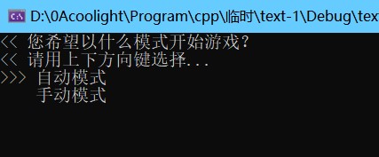 #include<conio.h> #include<windows.h> #include<iostream> using namespace std; namespace coolfun { //清空按键缓冲区,防止之前的残留按键行为的影响 void kbhit_remove() { while (_kbhit()) _getch(); } //等待按键并读取按下按键的 ASC码 int kbhit_wait_getasc() { int num; do { num = _getch(); } while (_kbhit()); return num; } /*光标移动函数 * x为横坐标,y为纵坐标 */ inline void light_gotoxy(int x, int y) { COORD pos = { (short)x,(short)y }; HANDLE hOut = GetStdHandle(STD_OUTPUT_HANDLE); SetConsoleCursorPosition(hOut, pos); } /*获取光标位置 * 同时获取xy,需要传入接受的xy变量引用 * x为横坐标,y为纵坐标 */ inline void light_getxy(int& x, int& y) { HANDLE hConsole = GetStdHandle(STD_OUTPUT_HANDLE); CONSOLE_SCREEN_BUFFER_INFO csbi; GetConsoleScreenBufferInfo(hConsole, &csbi); x = csbi.dwCursorPosition.X; y = csbi.dwCursorPosition.Y; } /*选择函数 * 返回选择的content_str[]的位置,默认1开始 * case_num:contentstr的数组大小;contentstr[]:选项内容 * >支持偏移< */ template<typename T> int switch_case(int case_num, const T* content_str) { int nowi = 1, nowx, nowy;//nowi 记录选择的选项编号 coolfun::light_getxy(nowx, nowy); cout << "<--请用上下键选择 | Enter键确定-->"; coolfun::light_gotoxy(nowx, nowy + 1); const T* p = content_str; cout << ">>> " << *(p++); for (int i = 2; i <= case_num; ++i) //先打印选项内容 { coolfun::light_gotoxy(nowx, nowy + i); cout << " " << *(p++); } coolfun::light_gotoxy(nowx, nowy + case_num + 1); coolfun::kbhit_remove();//清除残留按键 for (int getnum;;) //等待按键按下,getnum记录按键asc { getnum = coolfun::kbhit_wait_getasc(); coolfun::light_gotoxy(nowx, nowy + nowi); //移动到原来的编号选项前 cout << " "; //覆盖掉它的">>>" switch (getnum) //获取按下的按键的ask2值 { case 72: //上 { if (nowi > 1) //在第一个再按上键会到最后一个 --nowi; else nowi = case_num; }break; case 80: //下 { if (nowi < case_num) //在最后一个按下键会到第一个 ++nowi; else nowi = 1; }break; case 13: //Enter键确定 { coolfun::light_gotoxy(nowx, nowy + nowi); cout << "-->"; coolfun::light_gotoxy(nowx, nowy + case_num + 1); return nowi; //返回当前选项编号 }break; } coolfun::light_gotoxy(nowx, nowy + nowi);//移动到修改后的位置 cout << ">>>"; coolfun::light_gotoxy(nowx, nowy + case_num + 1); //把光标移动回输出的最后 } return 0; } } int main() { cout << "歪比巴布占用了这一行" << endl; cout << "玛卡巴卡占用了这一行" << endl; cout << "反冲斗士芭芭拉也需要一行" << endl; string str[] = { "1.自动模式", "2.手动模式", }; cout << "<< 您希望以什么模式开始游戏?" << endl; cout << "\n<< 您选择了选项" << coolfun::switch_case(2, str) << endl; return 0; }