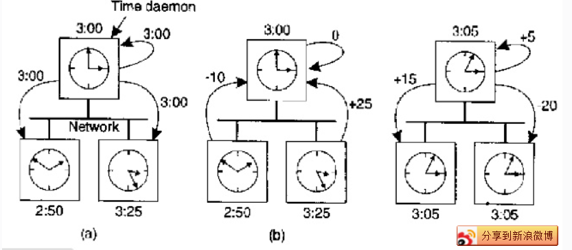 这个算法的主要时间不同在于各个服务器是主动的将自己的时间报告给服务器,服务器告诉它需要如何调整。