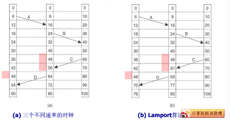 在时刻6,消息A被发送到时刻16,这是正常的,因为它带的时间搓是6,进程2会认为它经过了10的滴答用于传输。而消息B同理。但是,消息c的时间戳是60,到达的进程2 的时候却是56,所以进程b会调整自己的时钟到61,搞好比60晚1个滴答。这样来校正自己的时间。