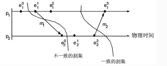 而右边的割集是一致的,因为发送e22的事件包含了,这个时候消息还没有到达p1,其割集恰好表示消息还在路上。