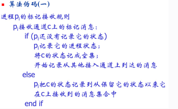 标记接收规则规则: 强制进程在记录下自己的状态之后,但是在他们发送其他消息前,发送一条- - 标记。