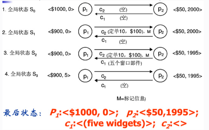 1. p1在实际的全局状态S0中记录他自己的状态 P1: <$1000, 0>。根据标记发送规则,p1在通过通道c2发送下一个应用层消息(订单10, $100)之前, 在它的外出通道c2上发送一个标记消息。系统进入S1。