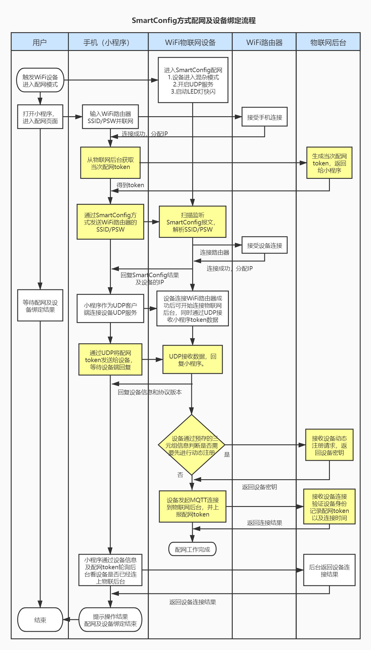 基于该协议,设备端在连接WiFi路由器成功之后,会告知手机端自己的IP地址,这个时候手机端可以通过数据通道比如TCP/UDP通讯将后台提供的配网token发送给设备,并由设备转发至物联网后台,依据token可以进行设备绑定。