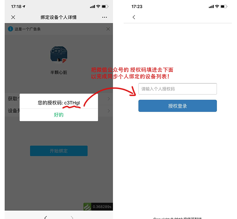 - 4、开始测试同步验证,确保您已经添加了设备,然后再微信公众号个人中心点击 “获取授权码”,注意 大小写,输入授权界面,如下界面: