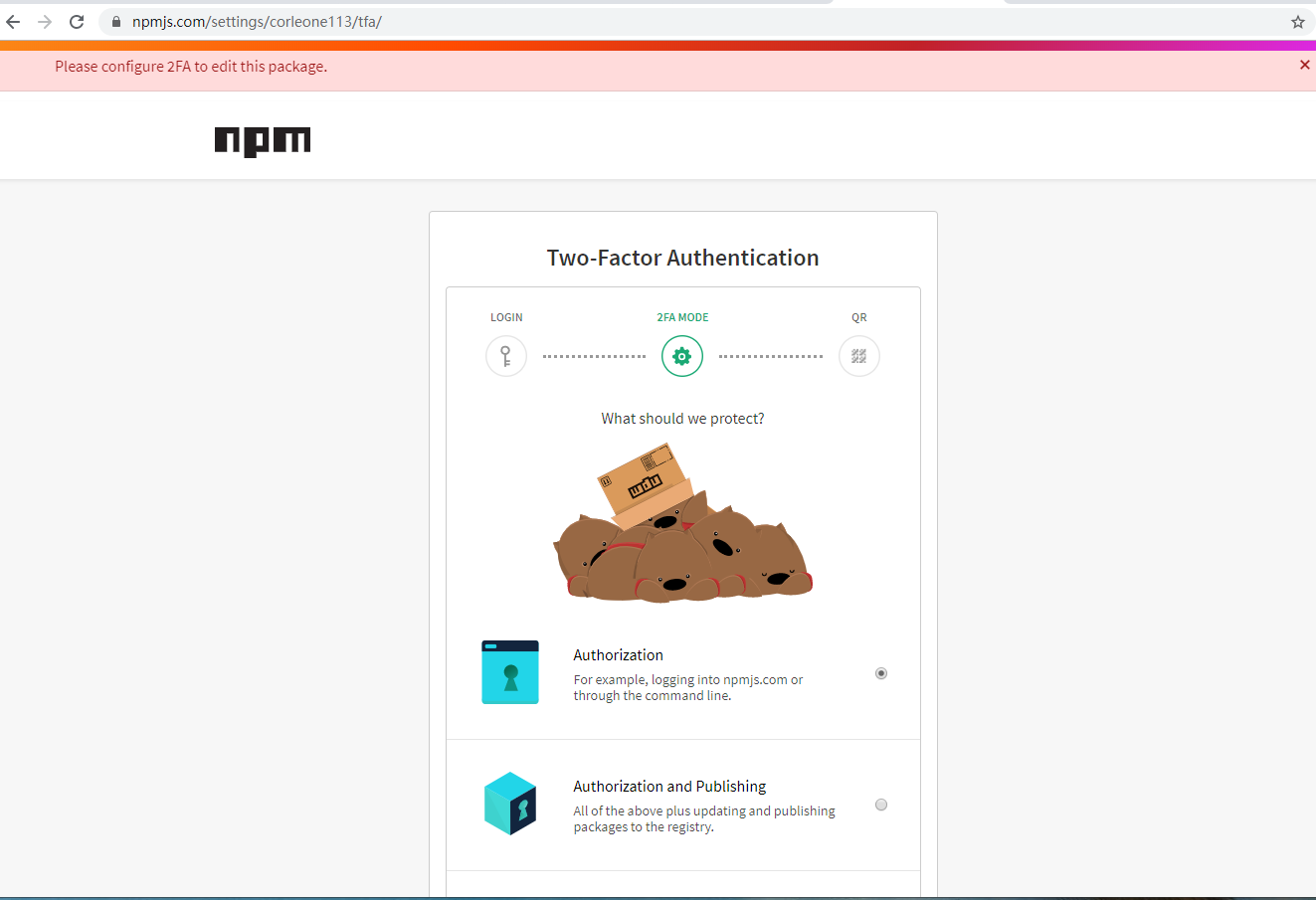- 登录npmjs官网,如果是首次发布就点击头像然后点击account选项然后在页面中找到Enable 2FA选项并点击;而如果是更新包的话就直接进入自己包的页面然后切换到setting页面下,然后就会出现下面的页面: