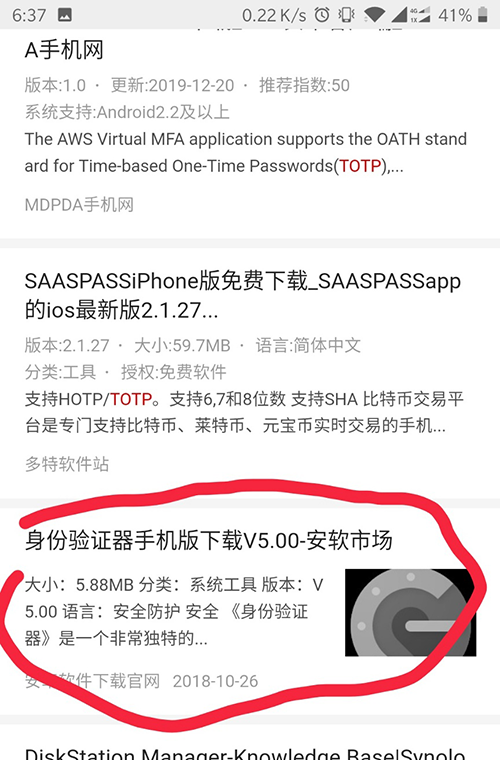 2.选择第一个选项就会出来一个二维码的页面,到这里如果是实现过2FA的朋友应该知道怎么做了,关于2FA原理可以参考阮大神的文章http://www.ruanyifeng.com/blog/2017/11/2fa-tutorial.html,有时间和精力的朋友可以尝试自己实现一个,没有这方面条件那用现成的吧——打开手机上的浏览器扫描二维码,然后就会进入一个搜索结果页面,在页面中找到如下的软并下载(有VPN的也可以使用微软或谷歌的Authenticator手机app):