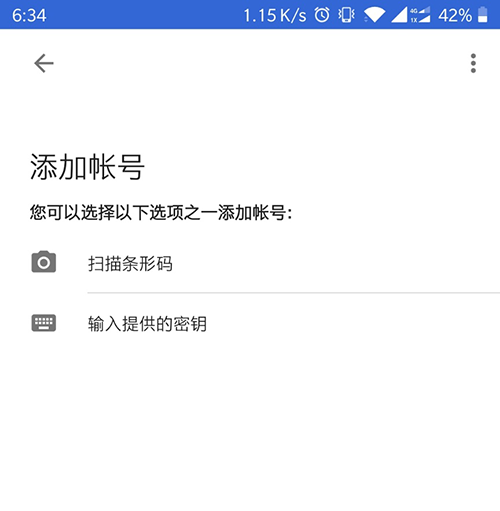 3.打开软件,点击开始然后就会进入添加账号界面,这个软件的二维码功能貌似不可用,所以选择 输入提供的密钥 来添加账号:
