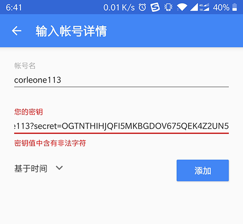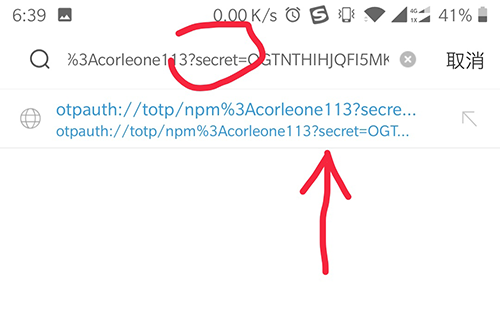 4.然后添加账号的界面中,账号就是你的npm账号,而密码并不是你npm账号的登录密码,而是扫描二维码时生成那个密钥——在第二步中手机浏览器扫描二维码时,观察浏览器的url会发现其中有一个查询字符串secret: