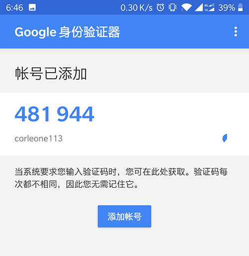 6.然后添加账号就成功了,app会自动进入显示2FA验证码的页面: