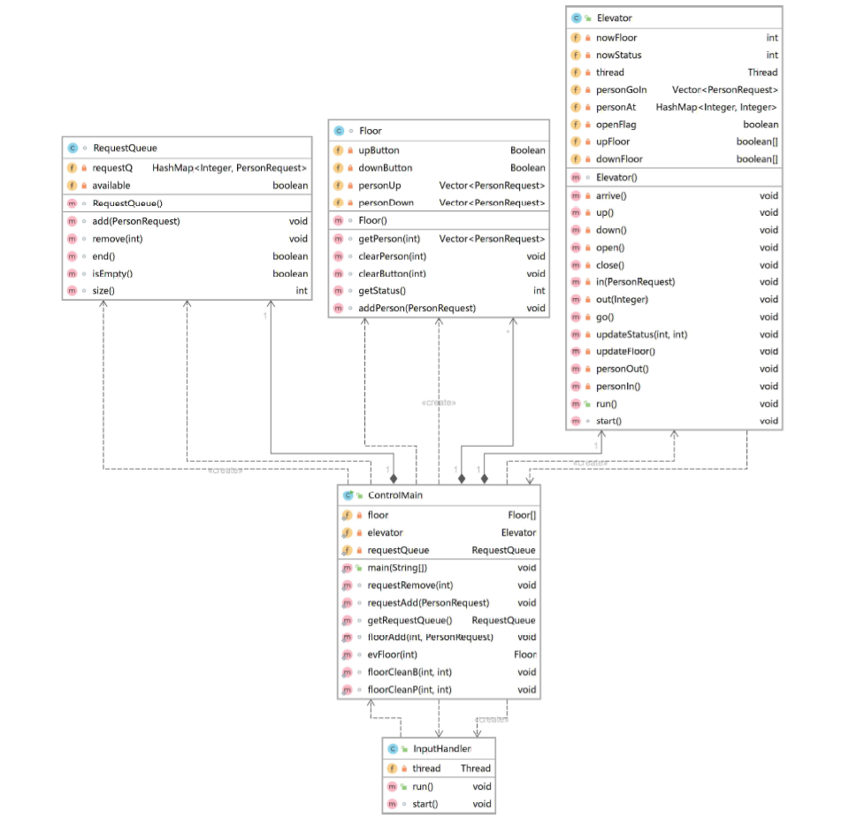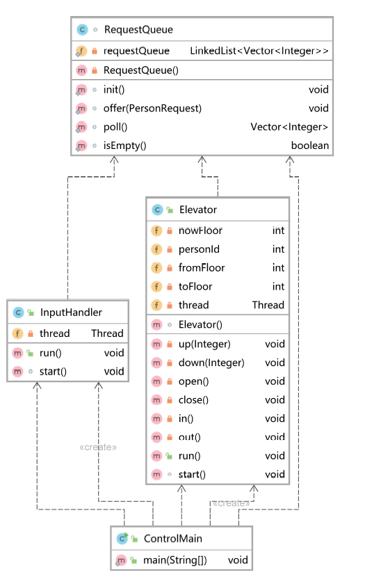 使用了楼层类,模拟电梯交互,在读入请求时,向请求队列里加入请求,并把请求分发到对应的开始楼层,模拟人在电梯前面排队。每个楼层类包含两个排队的队列和两个按钮,上楼下楼。当电梯上楼的时候,询问到达的每一层,是否有人上楼,有就带上,下楼时候同理。