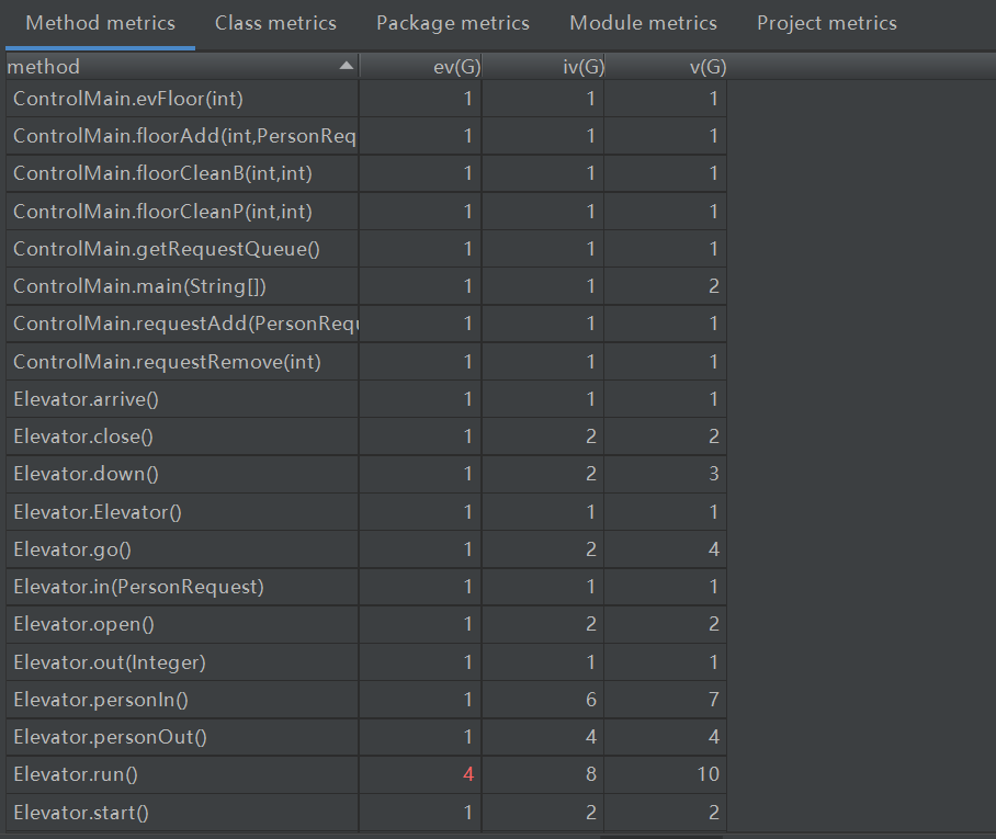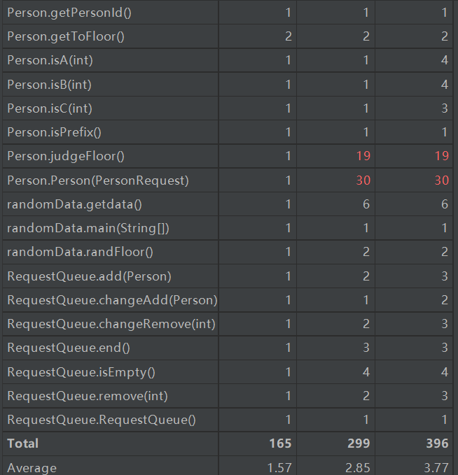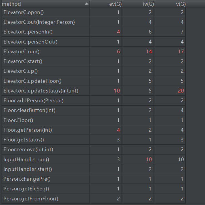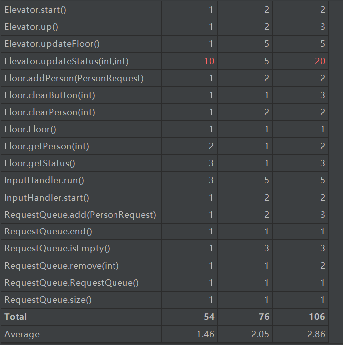 updatestatus的复杂度有点高,因为用了很多if-else来判断电梯状态如何更新的情况。我自认为做到了一个正常电梯该做的调度,但是强测只有86分,感觉有太多为了优化而优化的地方,我只是做了一个平时坐的电梯那样子的基础优化。不过我觉得完全按照运行时间来判定性能确实会让一些电梯的行为变得很不合常理……