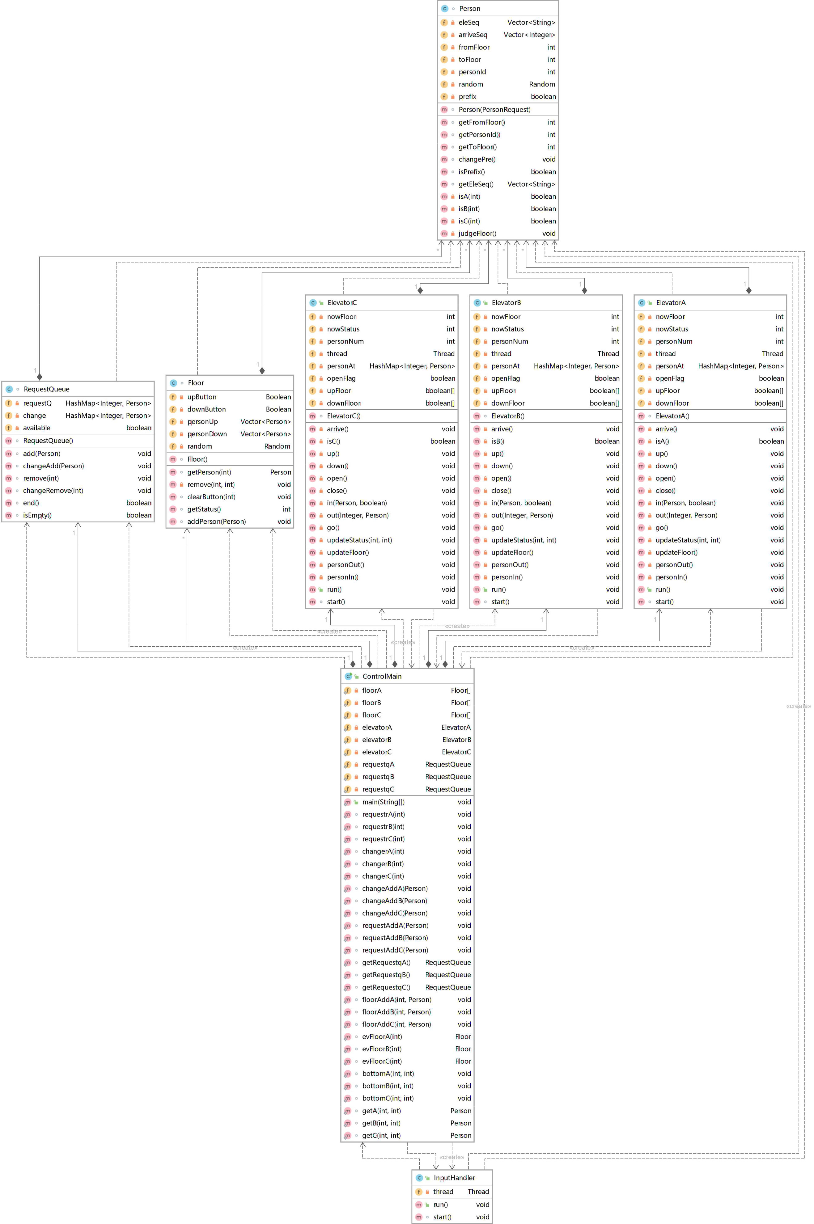 第七次作业确实感觉难度突然上了个档次,我选择了很偷懒的办法,反正目的也不是为了性能分,就是为了能过个强测别无效作业而已。毕竟上一次的性能都不咋地,这一次调度再怎么优化,电梯本身性能也不行,基本放弃了性能分。刚开始以为蛮难的,没想到写的时候rush三四个小时就写好了,大概是因为没有考虑优化吧。为了方便我给每种电梯写了个电梯类,我知道方法不太好。