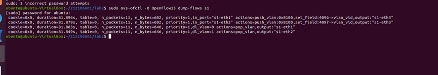 - 通过命令行终端输入“ovs-ofctl”命令,直接在s1和s2上添加流表,划分出所要求的VLAN。