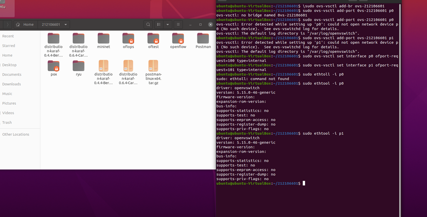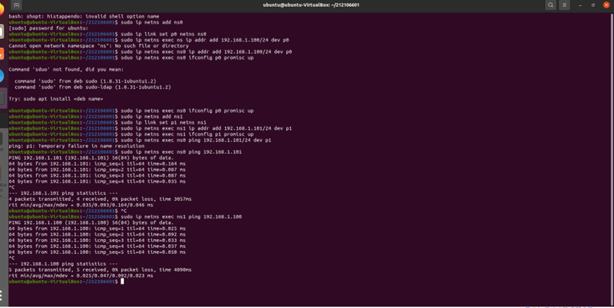 - ovs-vsctl基础操作实践:创建OVS交换机,以ovs-xxxxxxxxx命名,其中xxxxxxxxx为本人学号。在创建的交换机上增加端口p0和p1,设置p0的端口号为100,p1的端口号为101,类型均为internal;为了避免网络接口上的地址和本机已有网络地址冲突,需要创建虚拟网络空间(参考命令netns)ns0和ns1,分别将p0和p1移入,并分别配置p0和p1端口的ip地址为190.168.1.100、192.168.1.101,子网掩码为255.255.255.0;最后测试p0和p1的连通