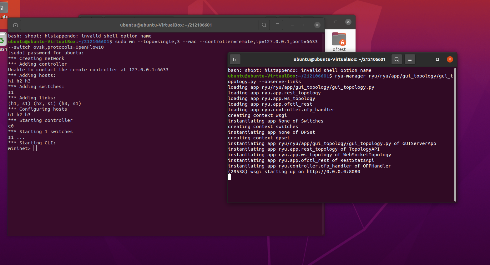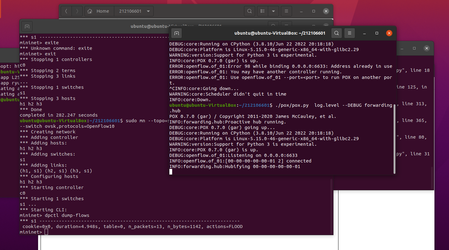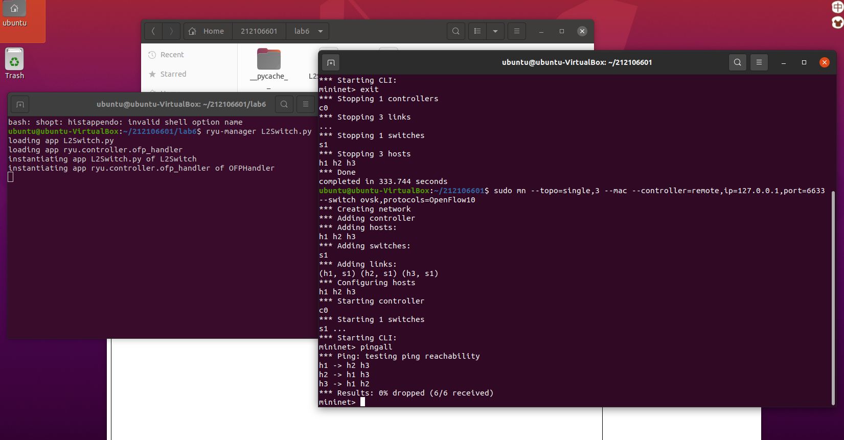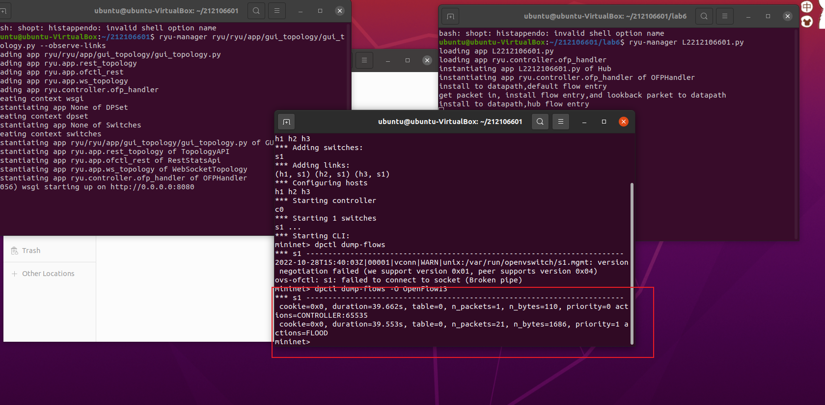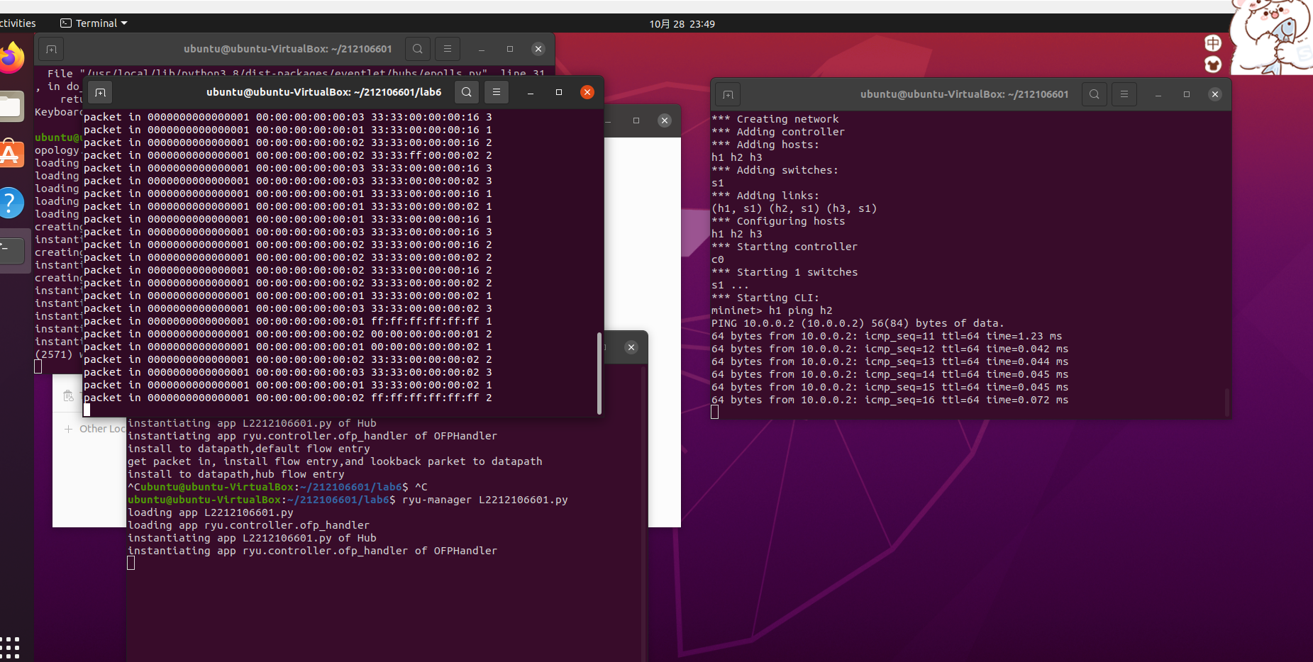 通过本次实验,让我熟悉了RYU控制器实现软件定义的集线器和交换机原理。在L2Switch模块查看流表时报错,通过找资料发现,应该先打开L2Switch模块在启动ryu控制器,构建拓扑图,改正后也成功的ping通,中间执行L2212106601.py使用报错经过资料搜寻之后发现需要指定OpenFlow版本为13就没有报错了,查看流表的时候也需要指定openFlow版本号为13