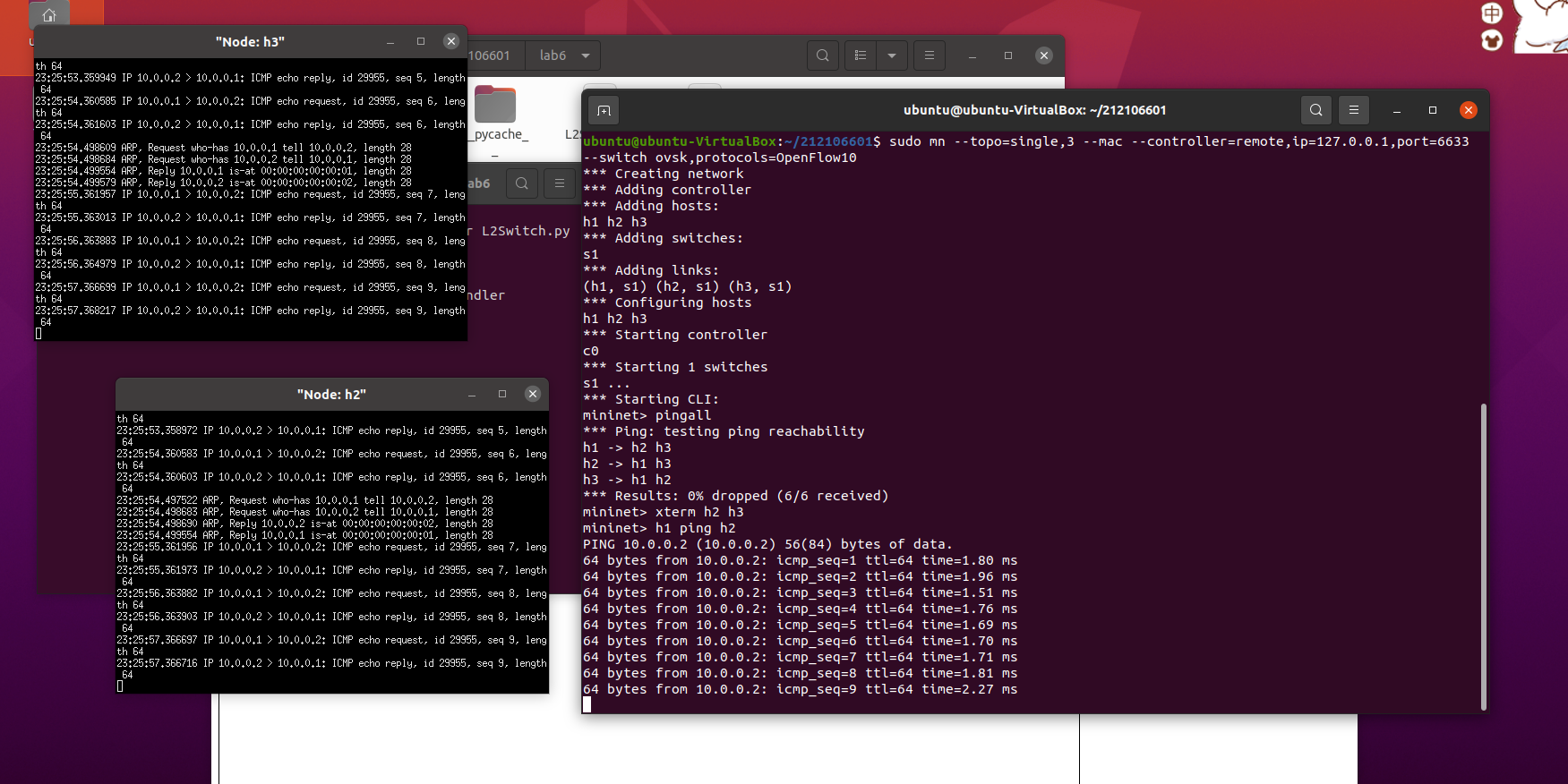 - 阅读Ryu文档的The First Application一节,运行当中的L2Switch,h1 ping h2或h3,在目标主机使用 tcpdump 验证L2Switch,分析L2Switch和POX的Hub模块有何不同。