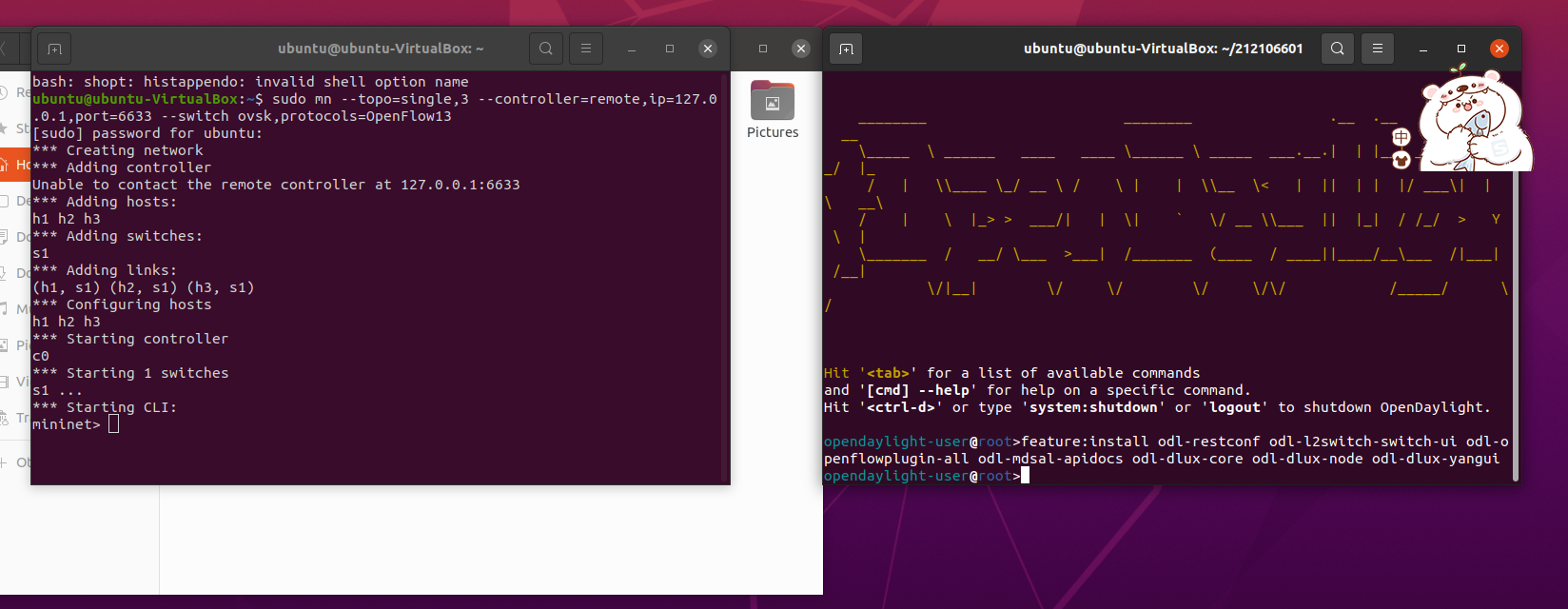 - 在虚拟机中安装Ubuntu 20.04 Desktop amd64,并完整安装Mininet、OpenDaylight(Carbon版本)、Postman和Ryu;