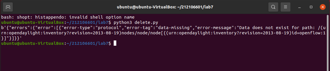 # delete.py import requests from requests.auth import HTTPBasicAuth if __name__ == "__main__": url = 'http://127.0.0.1:8181/restconf/config/opendaylight-inventory:nodes/node/openflow:1/' headers = {'Content-Type': 'application/json'} res = requests.delete(url, headers=headers, auth=HTTPBasicAuth('admin', 'admin')) print (res.content)