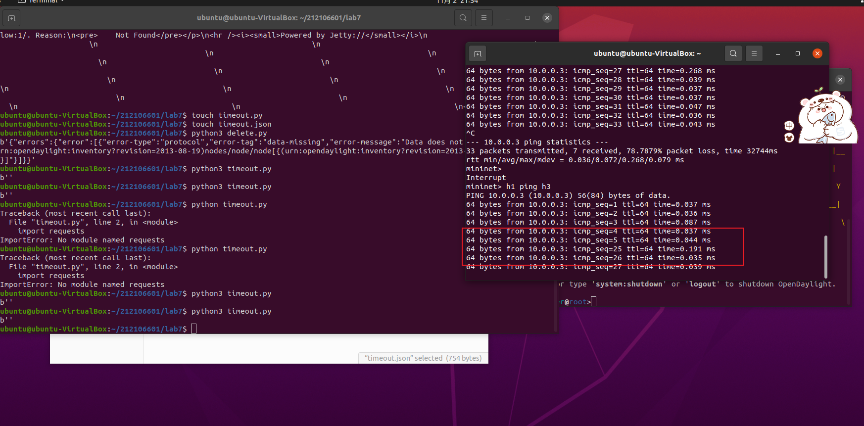 这次实验难度适中,运用了之前相关的OpenDaylight和Ryu的相关知识。实验中遇到了忘记启动Ryu控制器ryu-manager ryu.app.simple_switch_13 ryu.app.ofctl_rest以及未安装curl通过报错信息进行安装sudo apt install curl。