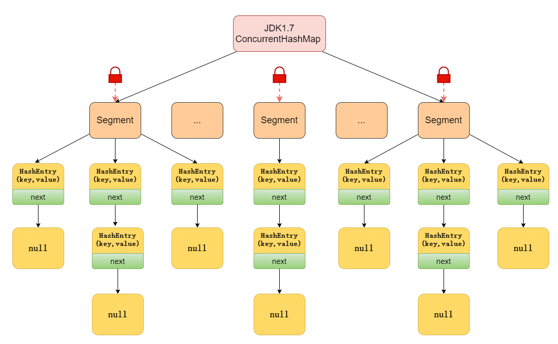 如下图所示,首先将数据分为一段一段的存储,然后给每一段数据配一把锁,当一个线程占用锁访问其中一段数据时,其他段的数据也能被其他线程访问,实现了真正的并发访问。