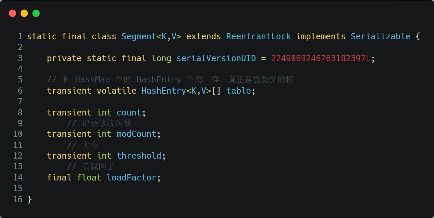 Segment 是 ConcurrentHashMap 的一个内部类,主要的组成如下: