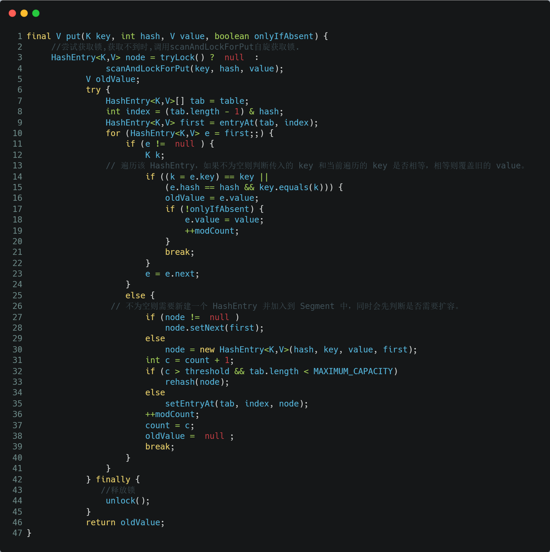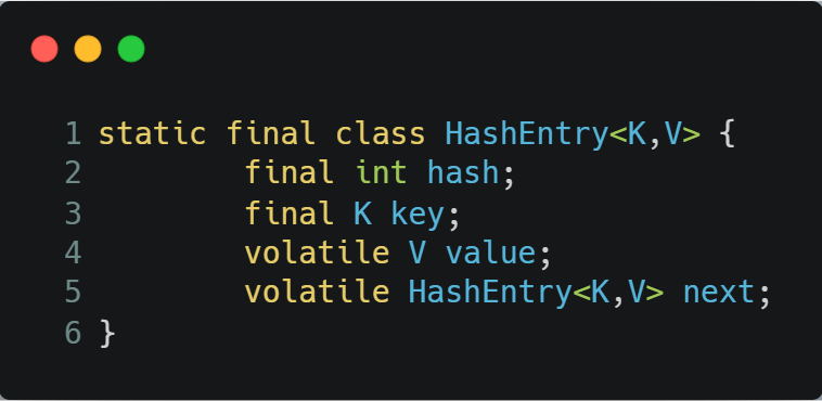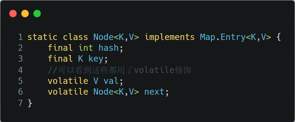 其中,用 volatile 修饰了 HashEntry 的数据 value 和 下一个节点 next,保证了多线程环境下数据获取时的可见性!