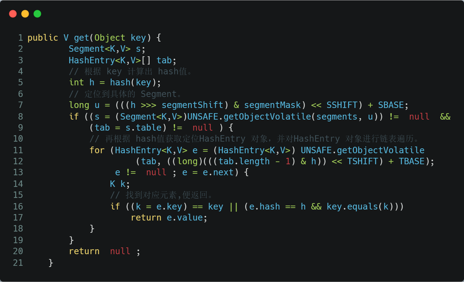 首先,根据 key 计算出 hash 值定位到具体的 Segment ,再根据 hash 值获取定位 HashEntry 对象,并对 HashEntry 对象进行链表遍历,找到对应元素。