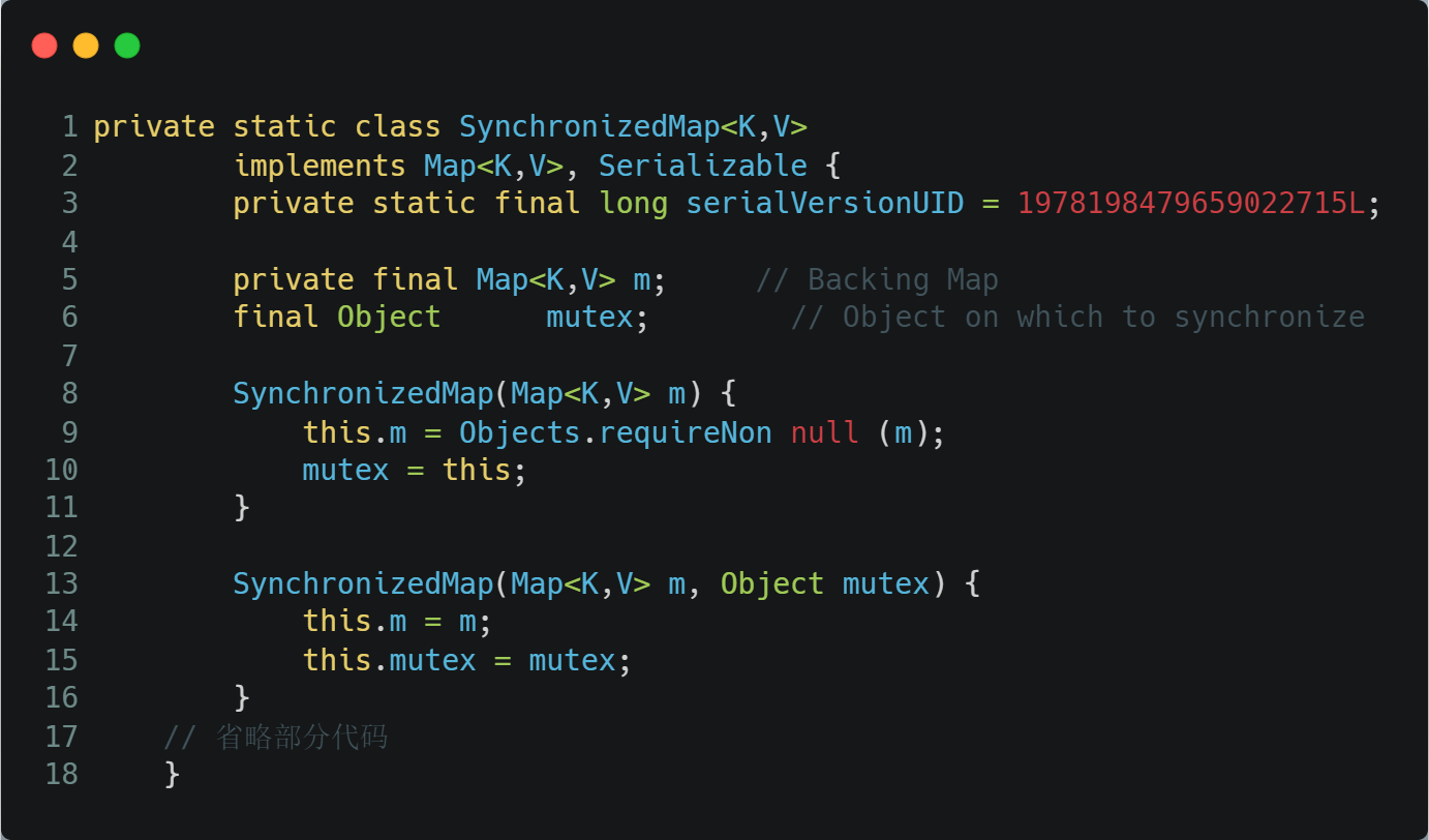 如果传入的是 HashMap 对象,其实也是对 HashMap 做的方法做了一层包装,里面使用对象锁来保证多线程场景下,线程安全,本质也是对 HashMap 进行全表锁。在竞争激烈的多线程环境下性能依然也非常差,不推荐使用!