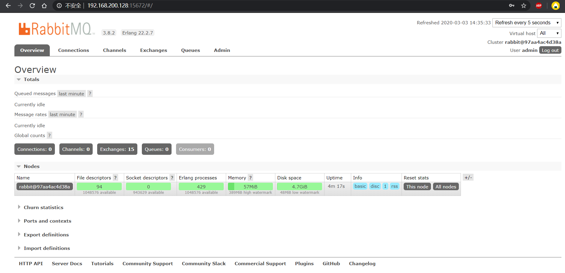 docker run -di --name myrabbit -e RABBITMQ_DEFAULT_USER=admin -e RABBITMQ_DEFAULT_PASS=admin -p 15672:15672 -p5672:5672 -p 25672:25672 -p 61613:61613 -p 1883:1883 rabbitmq:management