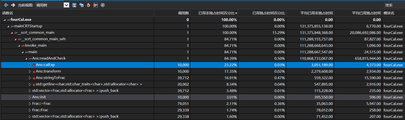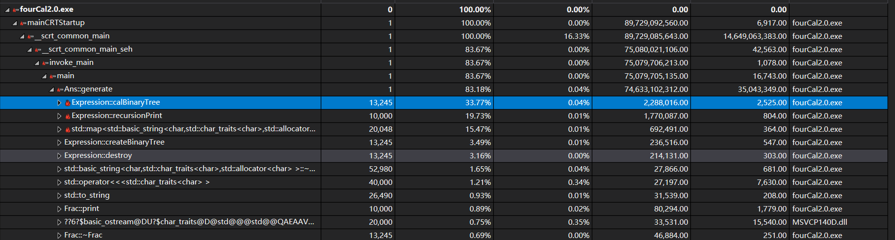 3. 效能分析:假设生成n条表达式,随机生成二叉树O(n);检查重复式子上,复杂度是O(n log(n)) (常数忽略,应该比较大),map容器的空间复杂度我不会分析。但是,只要n足够大,比如一百万以上,就会Memory Limit Exceeded,开不了那么大空间;其后是栈的top(取栈顶)操作,约占5%的时间。C++的输入输出流慢得很,尤其是输出到控制台,很多时间会花费在IO上,但是输出到文件上就问题不大,这样IO时间会很小,占不到1%。生成10000条式子程序能1~2s内跑完,但是Visual Studio生成vsp报告要等一会儿。