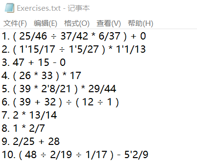 ⑤什么生成答案放文件里,对比文件那都是小儿科了,学学输入输出流就能搞定。我错了,要我读入文本并计算其中的式子......又要搞字符串啊啊啊啊啊!躲不过啊躲不过。不过还好问题不大,扫一遍字符串,把题目序号去掉,把字符串数字转化为Frac再比较答案就可以了。此处项目已基本完工。