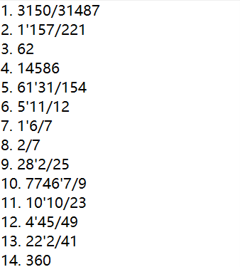 1 class Frac { 2 public: 3 Frac() { 4 numerator = 0; 5 denominator = 1; 6 opChar = ""; //如果op为空,则表示这个不是运算符 7 } 8 //以下重载+-*/运算符 计算时一边约分并没有什么用,全部是素数的话数字一大就会炸, 9 Frac operator + (const Frac& x) { 10 Frac frac; 11 frac.denominator = this->denominator * x.denominator; 12 frac.numerator = this->numerator * x.denominator + x.numerator * this->denominator; 13 return frac; 14 } 15 Frac operator - (const Frac& x) { 16 Frac frac; 17 frac.denominator = this->denominator * x.denominator; 18 frac.numerator = this->numerator * x.denominator - x.numerator * this->denominator; 19 return frac; 20 } 21 Frac operator / (const Frac& x) { 22 Frac frac; 23 frac.denominator = this->denominator * x.numerator; 24 frac.numerator = this->numerator * x.denominator; 25 return frac; 26 } 27 Frac operator * (const Frac& x) { 28 Frac frac; 29 frac.denominator = this->denominator * x.denominator; 30 frac.numerator = this->numerator * x.numerator; 31 return frac; 32 } 33 //以下是随机生成的函数,或分数或整数或符号 34 void setFraction(int range) { 35 this->denominator = rand() % range + 1; 36 this->numerator = rand() % (range + 1); 37 } 38 void setInteger(int range) { 39 this->numerator = rand() % (range + 1); 40 this->denominator = 1; 41 } 42 void setNum(int range) { 43 this->opChar = ""; 44 rand() % 2 ? setFraction(range) : setInteger(range); 45 } 46 void setOpChar(int isBrac) { 47 if (!isBrac) { 48 int select = rand() % 4; 49 switch (select) { 50 case 0: 51 this->opChar += "+"; 52 break; 53 case 1: 54 this->opChar += "-"; 55 break; 56 case 2: 57 this->opChar += "*"; 58 break; 59 case 3: 60 this->opChar += "÷"; 61 break; 62 default: 63 break; 64 } 65 } 66 else { 67 isBrac == 1 ? this->opChar += "(" : this->opChar += ")"; 68 } 69 } 70 //输出函数,输出分数是最简形式,符号直接输出 71 void print(ofstream &file) { 72 if (this->opChar == "") { 73 int GCD = gcd(this->denominator, this->numerator); 74 this->denominator /= GCD, this->numerator /= GCD; 75 if (this->denominator == 1) //整数 76 file << this->numerator << ' '; 77 else if (this->numerator > this->denominator) { //带分数 78 file << this->numerator / this->denominator << '\'' << this->numerator % this->denominator << '/' << this->denominator << ' '; 79 } 80 else //真分数 81 file << this->numerator << '/' << this->denominator << ' '; 82 } 83 else { 84 file << this->opChar << ' '; 85 } 86 } 87 public: 88 int numerator; 89 int denominator; 90 string opChar; 91 };