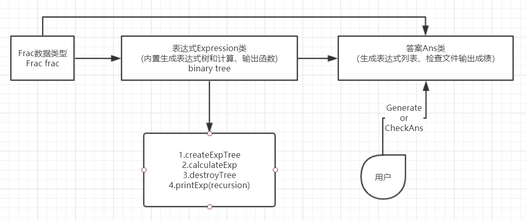 1 class Expression : public Frac { 2 public: 3 struct treeNode { 4 Frac data; 5 treeNode* lchild, * rchild; 6 treeNode() { 7 lchild = NULL; 8 rchild = NULL; 9 } 10 }; 11 public: 12 void createBinaryTree(treeNode*& root, int num, int range) { 13 root = new treeNode(); 14 num--; 15 if (num <= 0) { 16 root->data.setNum(range); 17 return; 18 } 19 20 root->data.setOpChar(NOTBRAC); 21 int left; 22 while (1) { 23 left = rand() % num; 24 if (left & 1) break; 25 } 26 createBinaryTree(root->lchild, left, range); 27 createBinaryTree(root->rchild, num - left, range); 28 } 29 void destroy(treeNode*& p) { 30 if (p) { 31 destroy(p->lchild); 32 destroy(p->rchild); 33 delete p; 34 p = NULL; 35 } 36 } 37 Frac calBinaryTree(treeNode*& p, string& path) { 38 if (!p->lchild && !p->rchild) 39 return p->data; 40 Frac left = calBinaryTree(p->lchild, path); 41 Frac right = calBinaryTree(p->rchild, path); 42 path += to_string(left.numerator) + to_string(left.denominator) + to_string(right.numerator) + to_string(right.denominator); 43 44 if (left.numerator < 0) return left; //处理负数 45 if (right.numerator < 0) return right; 46 47 string op = p->data.opChar; 48 if (op == "+") 49 return left + right; 50 else if (op == "-") 51 return left - right; 52 else if (op == "*") 53 return left * right; 54 else { 55 if (right.numerator == 0) { 56 right.numerator = -1; 57 return right; 58 } 59 return left / right; 60 } 61 } 62 bool shouldPrintBracket(treeNode*& p, bool leftOrRight) { 63 if (!p) return false; 64 treeNode* left = p->lchild; 65 treeNode* right = p->rchild; 66 if (!left || !right) return false; 67 68 Frac fatherData = p->data; 69 Frac leftData = left->data; 70 Frac rightData = right->data; 71 if (leftOrRight == LEFT) { 72 if (fatherData.opChar == "*" || fatherData.opChar == "÷") { 73 if (leftData.opChar == "+" || leftData.opChar == "-") 74 return true; 75 return false; 76 } 77 else 78 return false; 79 } 80 else { 81 if (fatherData.opChar == "*") 82 return (rightData.opChar == "+" || rightData.opChar == "-") ? true : false; 83 if (fatherData.opChar == "÷") 84 return (rightData.opChar == "+" || rightData.opChar == "-" || rightData.opChar == "*" || rightData.opChar == "÷") ? true : false; 85 if (fatherData.opChar == "+") 86 return (rightData.opChar == "+" || rightData.opChar == "-") ? true : false; 87 if (fatherData.opChar == "-") 88 return (rightData.opChar == "+" || rightData.opChar == "-") ? true : false; 89 return false; 90 } 91 } 92 void recursionPrint(treeNode*& p, ofstream &exerciseFile) { 93 if (!p) return; 94 Frac tmp; 95 if (shouldPrintBracket(p, LEFT)) { 96 exerciseFile << "( "; 97 recursionPrint(p->lchild, exerciseFile); 98 exerciseFile << ") "; 99 } 100 else 101 recursionPrint(p->lchild, exerciseFile); 102 103 p->data.print(exerciseFile); 104 if (shouldPrintBracket(p, RIGHT)) { 105 exerciseFile << "( "; 106 recursionPrint(p->rchild, exerciseFile); 107 exerciseFile << ") "; 108 } 109 else 110 recursionPrint(p->rchild, exerciseFile); 111 } 112 };