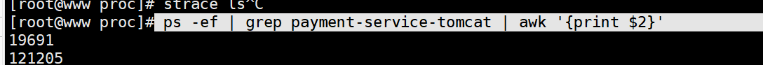 ①输入进程号 :ps -ef | grep payment-service-tomcat | awk '{print $2}' ,awk,$2: 表示第二行的值;