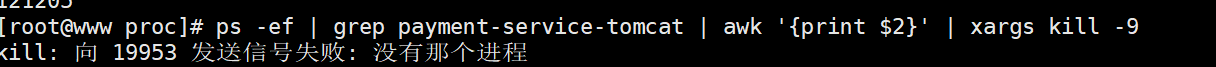 ps -ef | grep payment-service-tomcat | awk '{print $2}' | xargs kill -9