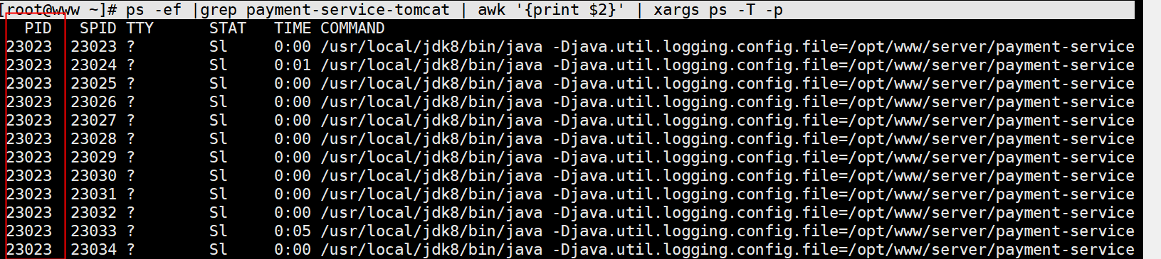 ④:查看进程下面的所有线程 ps -ef |grep payment-service-tomcat | awk '{print $2}' | xargs ps -T -p